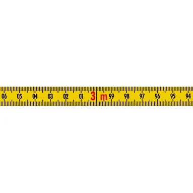 - Graduations - mm division on top and bottom edge in black, continuous centimetre numbering from 1 - 99 within each metre in black, number of decimetres black, number of metres red, repeated before each decimetre.