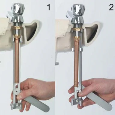 Armeg Jaw Dropper - the revolutionary tool for tightening taps without isolating the water supply. The Jaw Dropper set contains a basin wrench and a bath wrench with different jaws at either side of the wrench to cover a wide range of nut sizes. The slim design ensures maximum accessibility - simply slide the jaw of the wrench up the pipe to locate the nut.